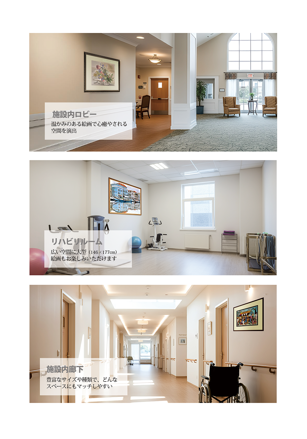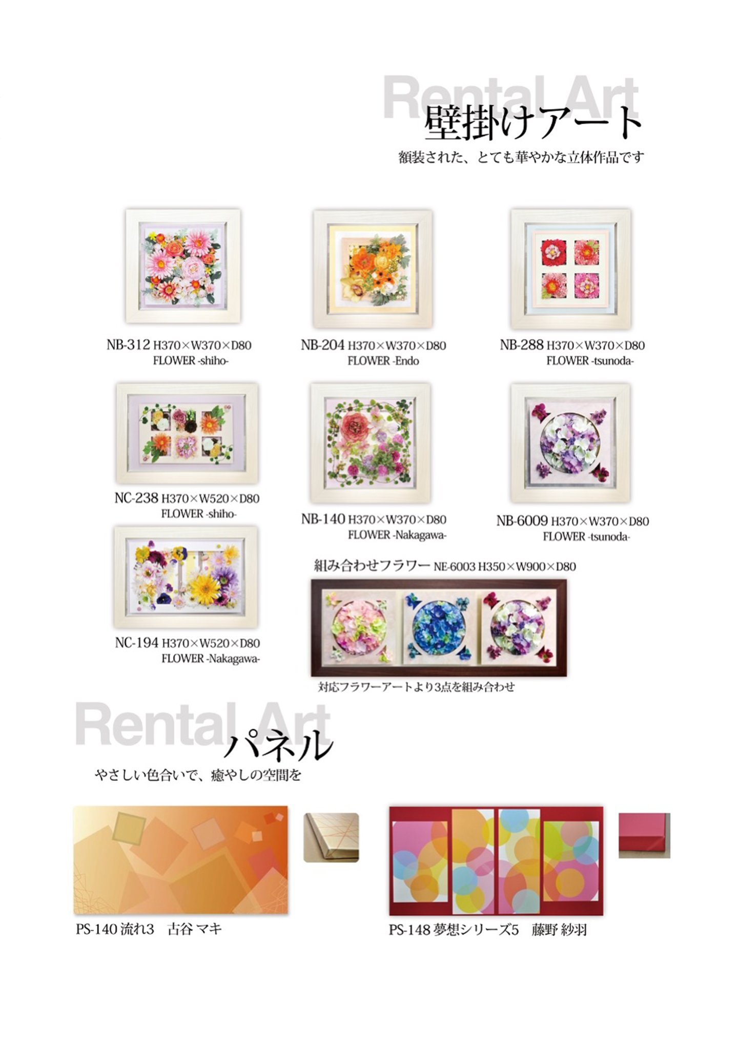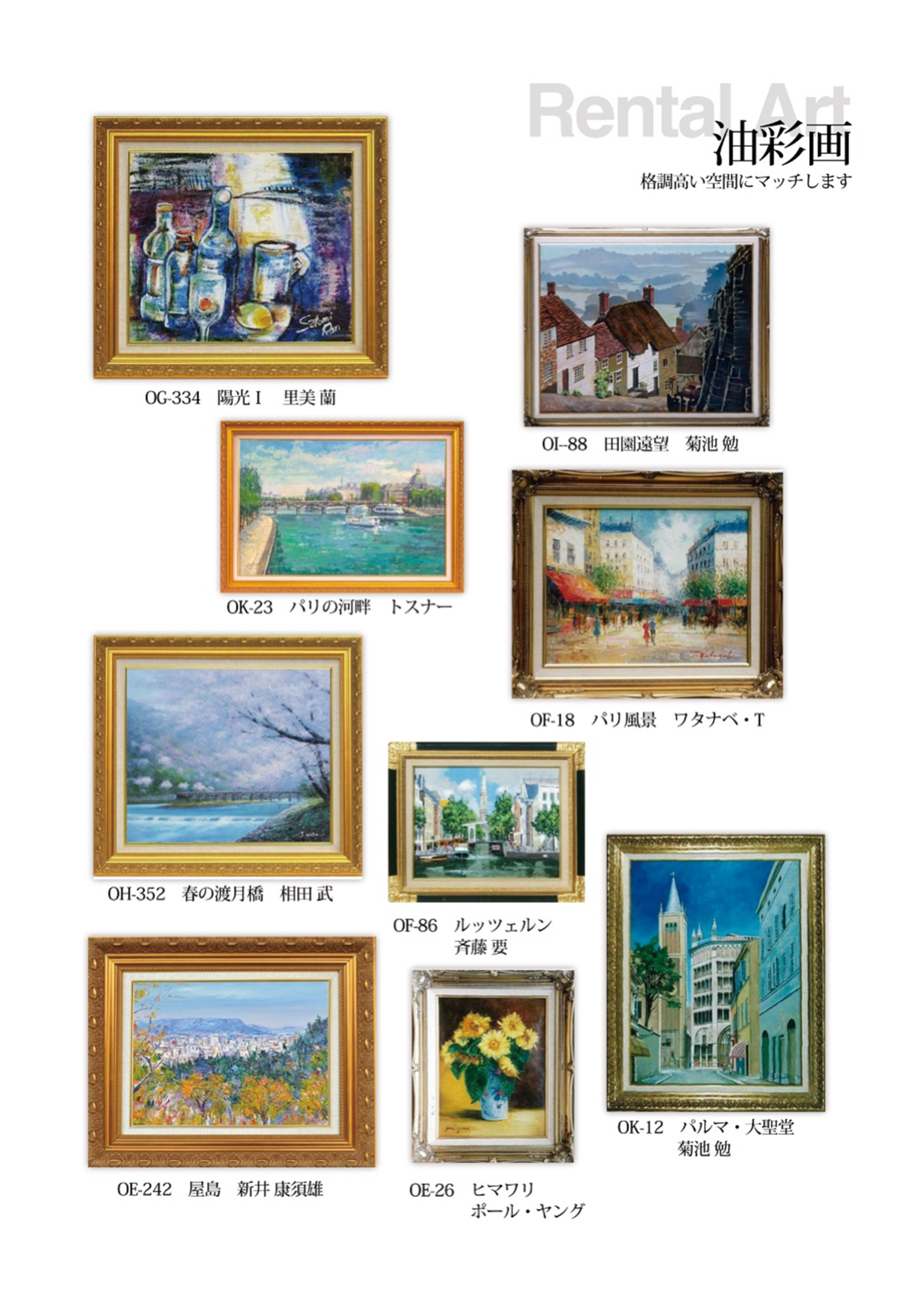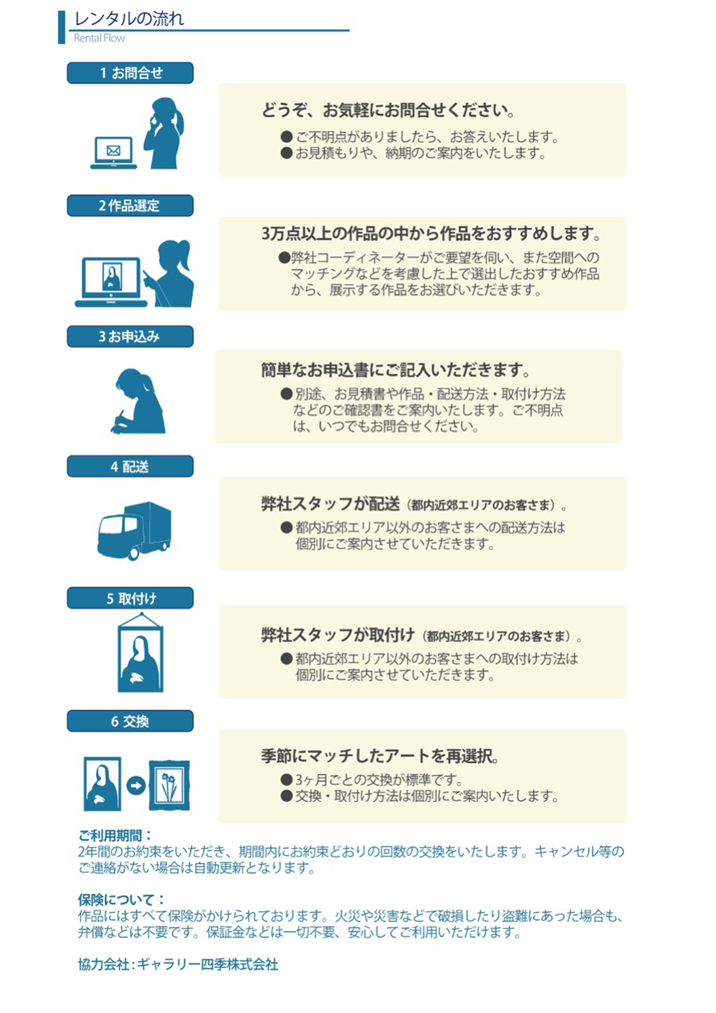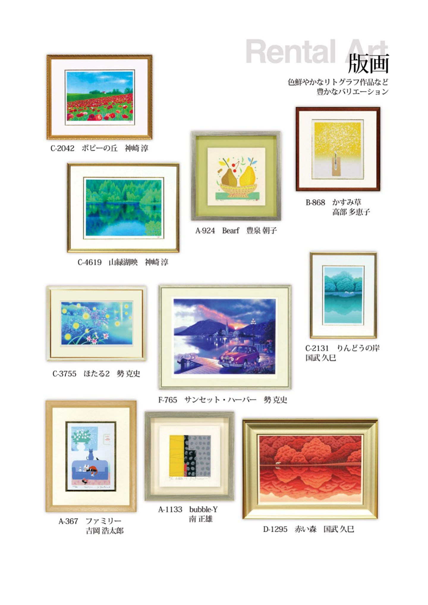 Art Rental レンタルアート 季節にあわせて、1年に4回。レコメンドさせていただいた作品の中から選んで交換していただける、レンタルサービスです。 設置例 クリックで拡大します。 導入事例 高齢者施設GH様(神奈川) アート・アートグリーン導入事例 事例を見る 高齢者施設GM様(神奈川) アート・アートグリーン導入事例 事例を見る 作品例 Contact お問合せフォーム