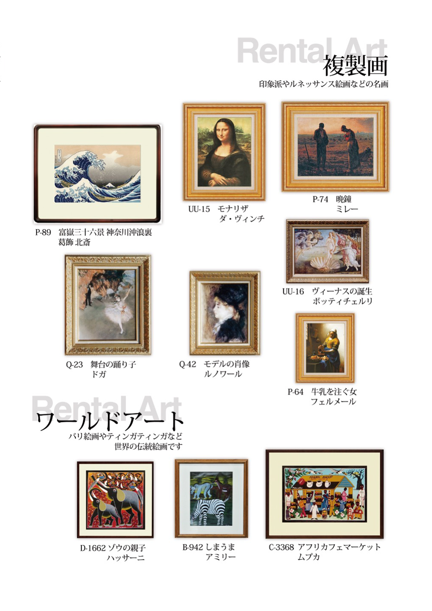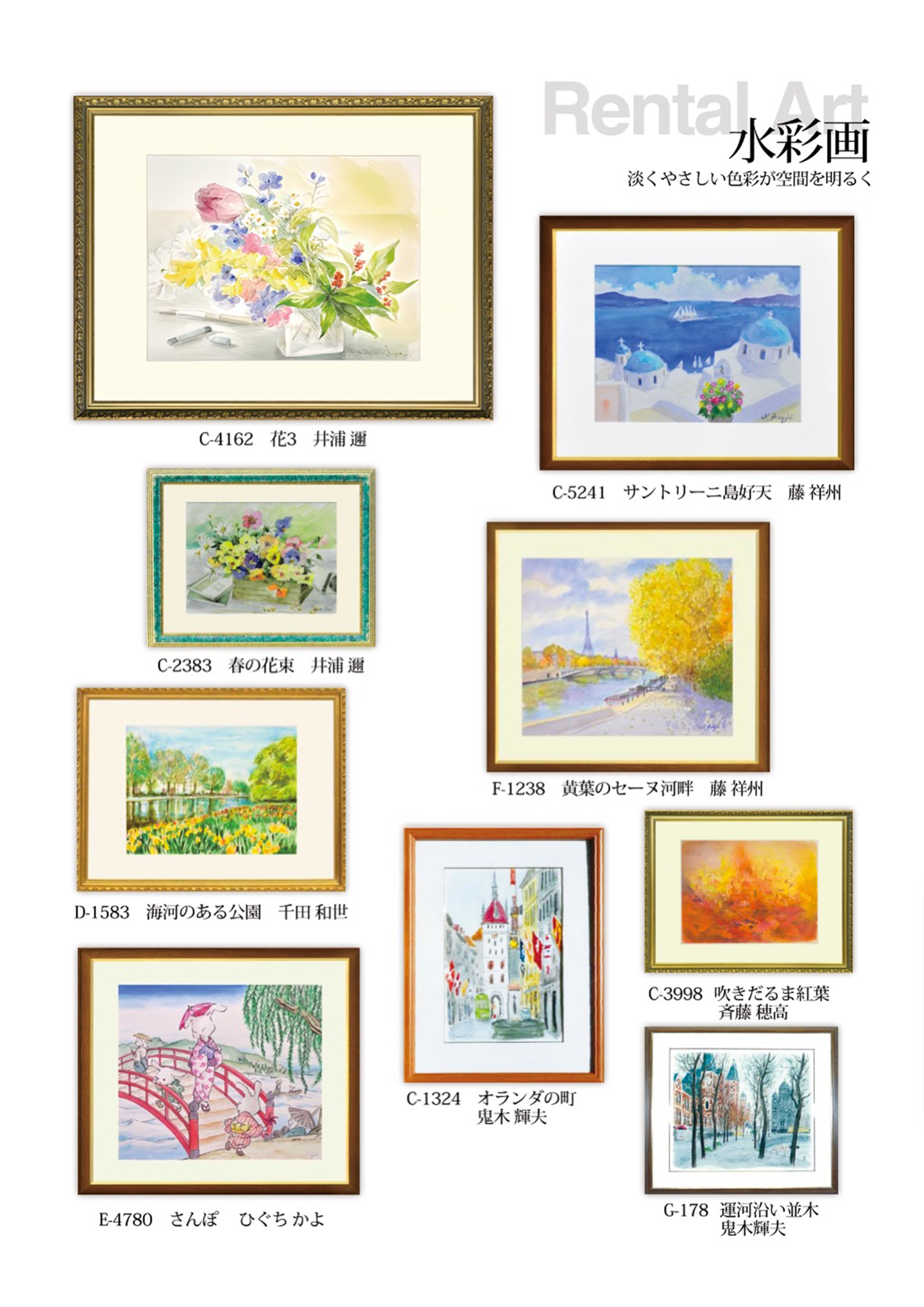 Art Rental レンタルアート 季節にあわせて、1年に4回。レコメンドさせていただいた作品の中から選んで交換していただける、レンタルサービスです。 設置例 クリックで拡大します。 導入事例 高齢者施設GH様(神奈川) アート・アートグリーン導入事例 事例を見る 高齢者施設GM様(神奈川) アート・アートグリーン導入事例 事例を見る 作品例 Contact お問合せフォーム